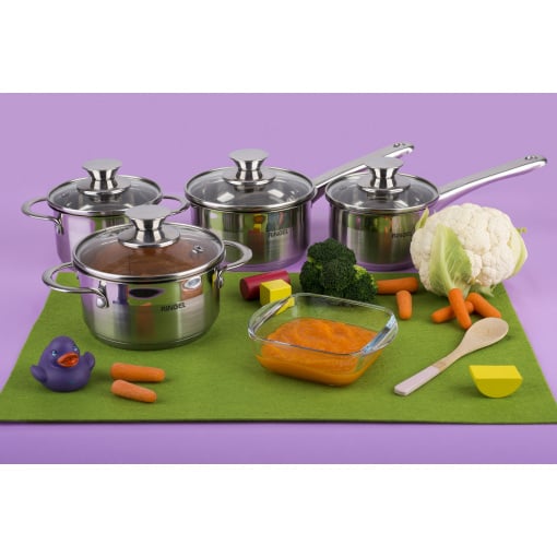 Линейка Kinder состоит из двух кастрюлек объемом 0.6 л и 1.0 л, а также включает два ковша аналогичного объема. Вся посуда серии изготавливается из экологической нержавеющей стали, прошедшей все необходимые испытания и получила соответствующие гигиенические сертификаты. Благодаря отполированной до блеска поверхности, посуду серии Kinder с легкостью впишется в любой кухонный интерьер и станет его настоящим украшением.
