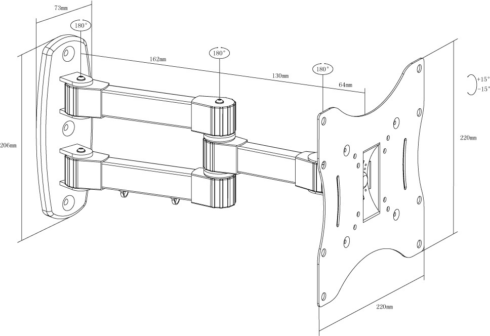 Кронштейн с возможностью поворота на 180° (до 90° в каждую сторону в зависимости от диагонали ТВ) и наклона до 15° вниз/вверх