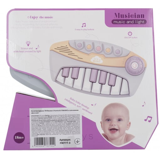 Музыкальная игрушка со световыми эффектами ПИАНИНО ТМ Funmuch. Имеет 13 клавиш пианино и 5 кнопок дополнительных зуковых эффектов, а также сопровождение световыми эффектами. Малыш легко сможет создать свою собственную мелодию, нажимая на кнопки или воссоздаст 5 стандартных композиций. Питание: 3 батарейки типа AA (входят в комплект). Материал: АБС-пластик. Подходит для детей от 18 месяцев. Размер игрушки 26х6.5х13.5 см. Упаковка: открытая коробка 27.5х25.5х7.5 см.