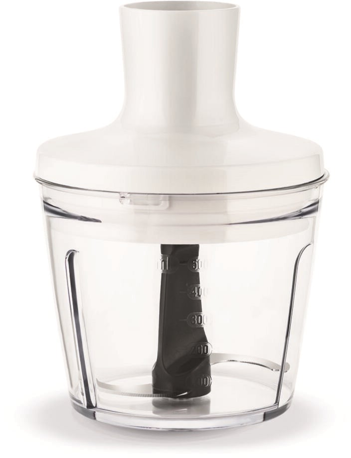 Чаша для измельчения объемом 500 мл за счет специфической конусной формы и расположенного под углом двухлопастного ножа избавляет от необходимости нарезать продукты вручную. С ней можно быстро и без проблем измельчить и порубить любые овощи, фрукты, мясо, рыбу, сыр, орехи и зелень, а также приготовить разнообразные соусы, коктейли, фарши и другие блюда, и заготовки. Все сменные аксессуары пригодны для мытья в посудомоечной машине (кроме элементов с приводом).