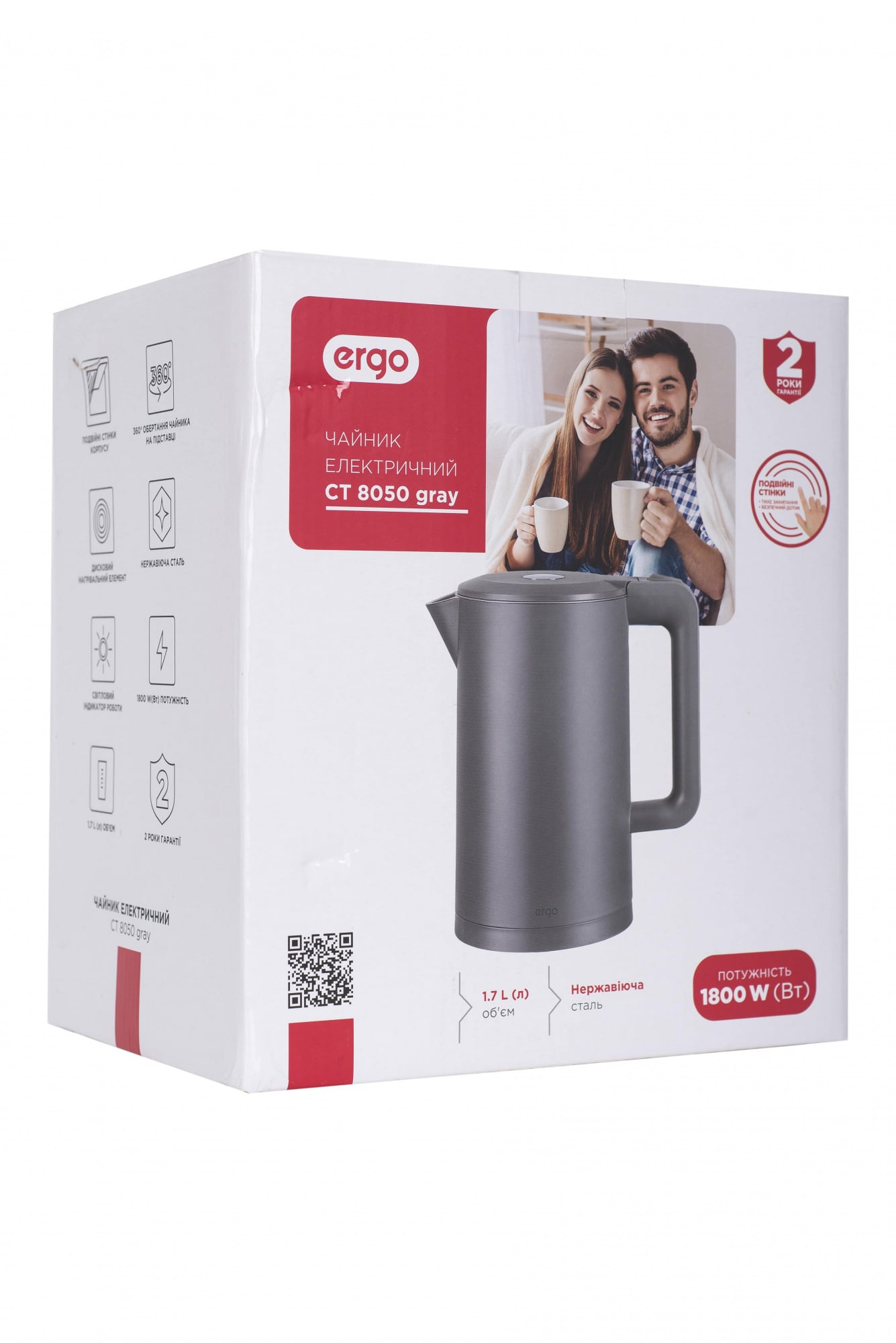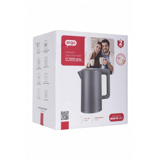 Електрочайник ERGO СT 8050 Grey – кухонний прилад для тих, хто цінує ергономічний дизайн, комфорт та функціональність. Корпус має подвійні стінки та виконаний із міцної гігієнічної нержавіючої сталі. Лаконічна форма та стильний сірий колір роблять модель вишуканим елементом дизайну на будь-якій кухні.