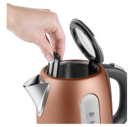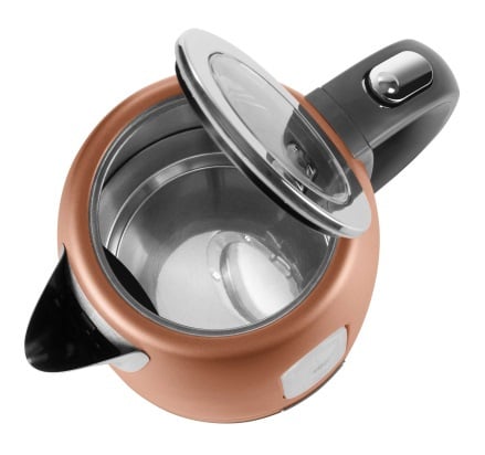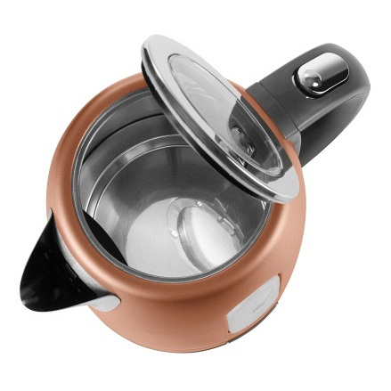 Встановлений на базу чайник вільно обертається на 360 градусів. Тут використовується закритий нагрівальний елемент, який служить набагато довше відкритих аналогів, так як не піддається кальцифікації. Чайник має мірну шкалу на корпусі, за допомогою якої легко набирати потрібну кількість води та не кип'ятити зайву.