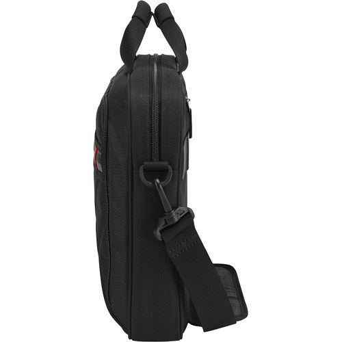 Модернизированная сумка, отвечающая требованиям современного профессионала, имеет удобную асимметричную подбивку и вмещает ноутбук, планшет и рабочие принадлежности в глубоком черном отделении с красными элементами отделки.